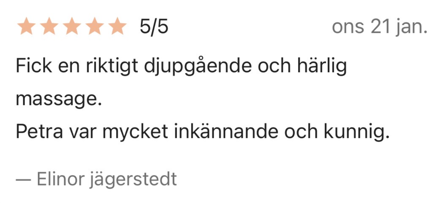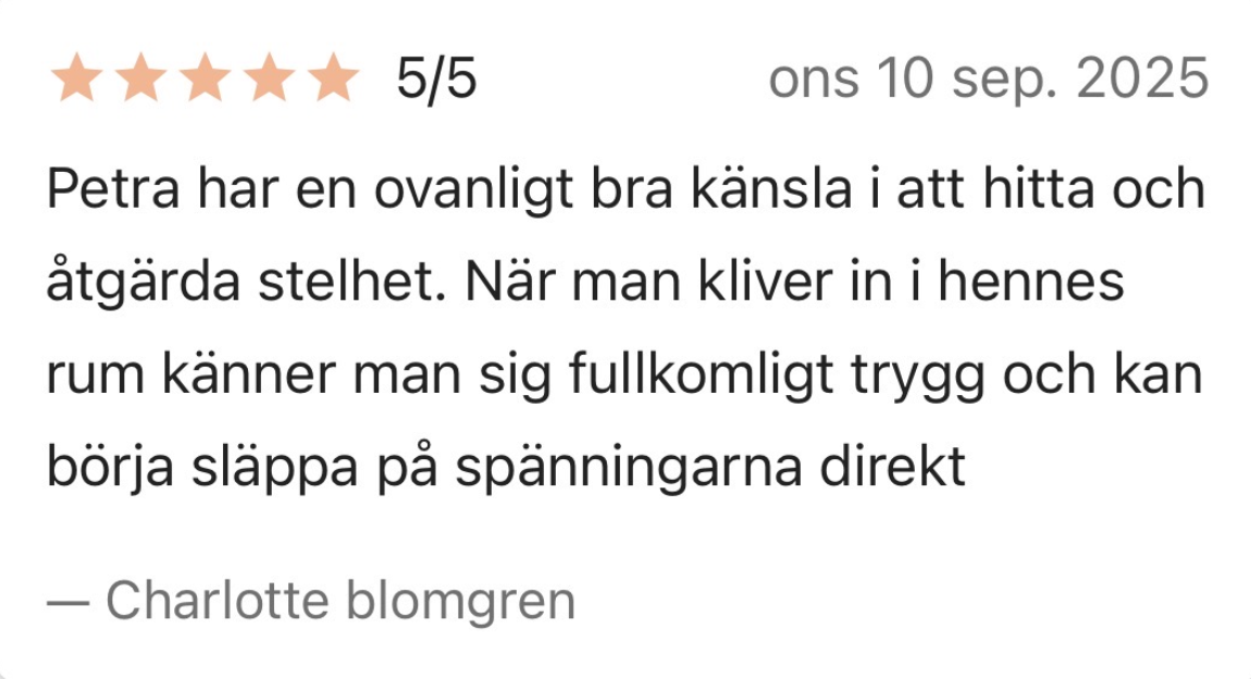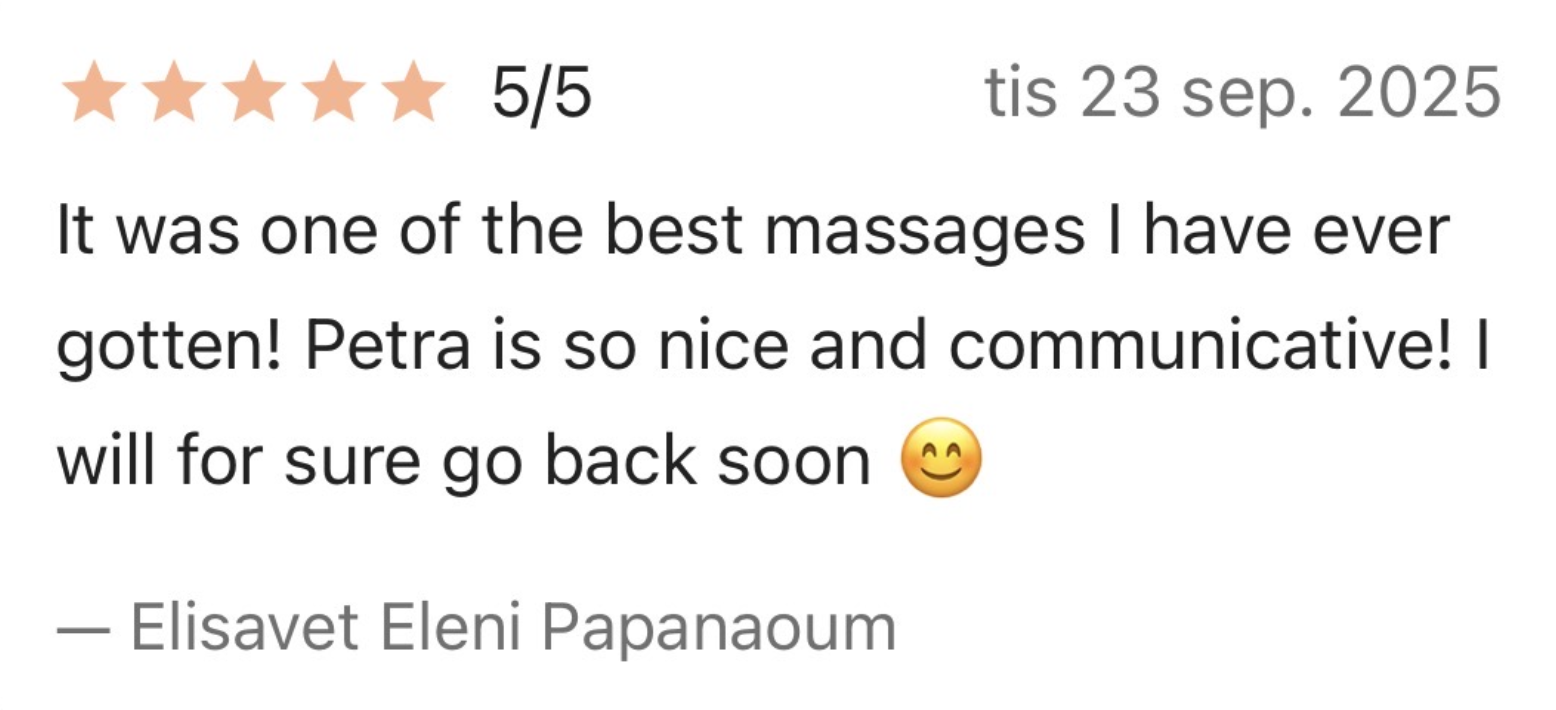 Petra Koppla Dahlberg är legitimerad massageterapeut utbildad vid Axelsons Gymnastiska Institut. Hon specialiserar sig på djupvävnadsmassage och hittar spänningar under ytan – inte bara lindrar symtom, utan behandlar grundorsaken. Med särskilt fokus på gravidmassage stöttar Petra både kropp och känslomässigt välbefinnande. Hon arbetar intuitivt med ett anatomiskt förhållningssätt och anpassar varje behandling efter dina individuella behov. Tillgänglig måndagar, tisdagar och fredagar.